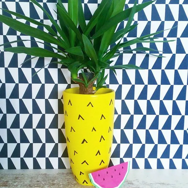 Här har jag spraymålat en hög vit blomkruka och sedan klippt ut dekor av svart dekorplast som jag fäst över hela krukan. Enkelt men sjukt effektfullt!