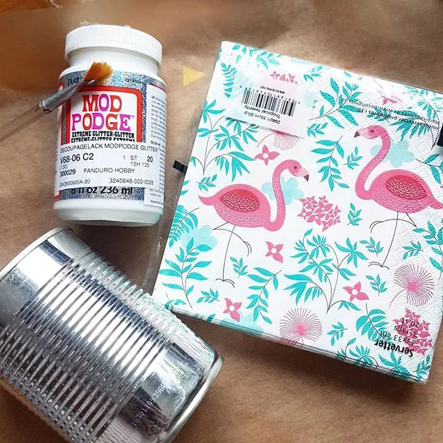 Barnens absoluta favorit - att kladda loss med decoupage och servetter! Det blir snyggt, hållbart och är riktigt enkelt. Du behöver konservburkar, servetter, decoupagelim (min innehåller dessutom glitter) och en pensel.