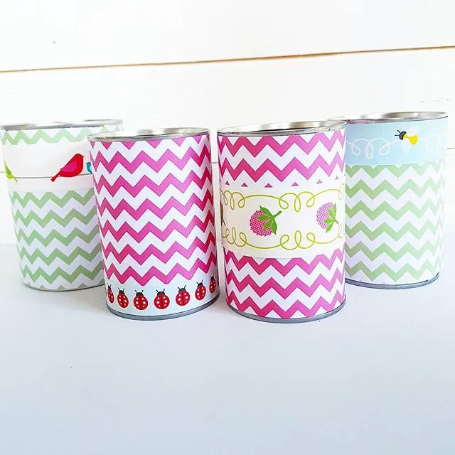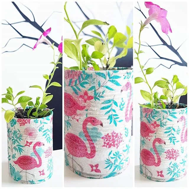 Klassikern! Konservburkar är toppen att plantera i och snabba att klä om med valfritt papper. Jag brukar skriva ut egna mönster på kartongpapper som jag fäster med limpistol. Går snabbt och torkar direkt.