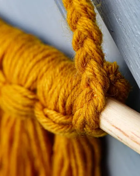 Lägg ihop trådarna och fäst dem på rundstaven genom att vika garnet dubbelt, lägga mittöglan över rundstaven och trä garnet genom sig själv. På diyinrednings Instagram finns en video som visar exakt hur det funkar.