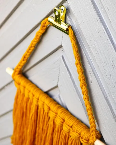 Jag satte en vanlig kontorsklämma från Clas Ohlson högst upp på flätan, men det är helt valfritt. Testa gärna olika färger, garner, pinnar, trä på pärlor, fläta trådarna som hänger ner. Kör loss!