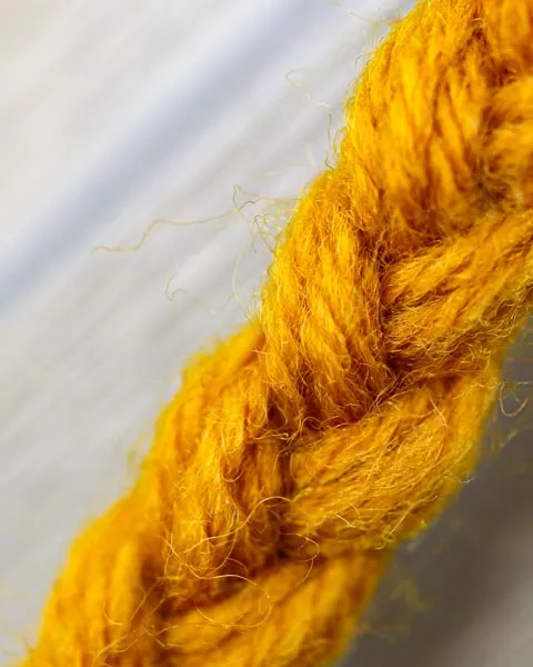 Garnet kommer från Rusta, härligt senapsgult, och kostade bara 10 kr per rulle. Jag använde bara ett halvt nystan till hela bonaden. Så detta är inte bara roligt och enkelt - det är billigt också!