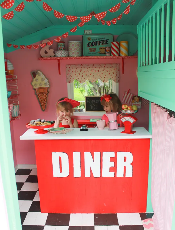 Jag har alltid inspirerats av 60-talets design och färger, och äntligen fick jag chansen att skapa ett retrocafe åt mina barn. Lekstugan blev en mixmatch av amerikanskt 60-talsdiner och svensk retrokiosk. Rött, turkos och rosa. En kombo som inte borde funka men som gör det.