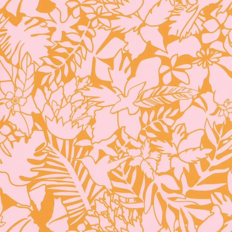 Vi valde att tapetsera med den orange-rosa tapeten med det passande namnet Smile. Mönster av vackra orange blommor och fåglar mot en blekrosa bas.